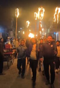 फर्रुखाबाद। (एफबीडी) आज सायं उत्तर प्रदेश युवा उद्योग व्यापार मंडल के उपाध्यक्ष अंकुर श्रीवास्तव के नेतृत्व में निकाले गए मशाल जुलूस में बजरिया चौकी इंचार्ज को सस्पेंड करने की नारेबाजी की गई। मशाल जुलूस की शुरुआत टाउन हॉल तिराहा से की गई। दर्जनों आंदोलनकारी मशाल जुलूस को लेकर चल रहे थे और जोरदारी से नारे लगा रहे थे की बजरिया चौकी इंचार्ज लछिमन सिंह को सस्पेंड करो। पक्का पुल चौराहे पर जुलूस की समाप्ति के दौरान मशालों को सड़क पर डालकर जलाया गया। इस दौरान व्यापारी नेता अंकुर श्रीवास्तव ने कहा कि भ्रष्टाचारी कार्यप्रणाली को लेकर मशाल जुलूस निकाला गया।